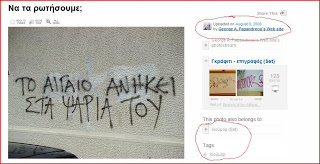 Παρότι γνωρίζουμε πολύ καλά τις ιδέες που πρεσβεύει ο Γιωργάκης, μείναμε έκπληκτοι όταν αντικρύσαμε απίστευτες εικόνες με εμετικά συθήματα, τα οποία το επιτελείο του έχει βάλει στο προσωπικό του άλμπουμ στο μεγαλύτερο σάιτ φωτογραφιών παγκοσμίως, το Flickr. Παραθέτουμε εδώ τις πιο χαρακτηριστικές:όσοι θέλουν να δουν ολόκληρο το άλμπουμ,προκειμένου να πεισθούν ότι δεν είναι… σύμπτωση,μπορούν να το κάνουν εδώ κι εδώ.