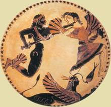 Οι Βορεάδες, Καλαίς και Ζήτης, κυνηγούν τις Άρπυιες. Λακωνικός κύλιξ 550 π.Χ.