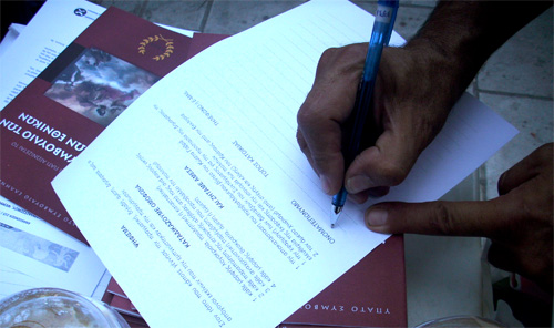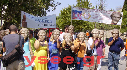 We are here, to inform you, and to demonstrate to the whole world that today in the birthplace of Democracy, democratic values are mere empty words. The true rulers of our society are the high ranking priests of the Christian Orthodox Church. As their institution is inseparable with the State, their control is unchallenged. Greece is probably the only country in Europe were there is no meaningful separation of Church and State, were the ministry of Education is also the ministry of religious affairs. In this way the Church manages to appropriate significant amounts of governmental funds to further increase their wealth and influence upon society.