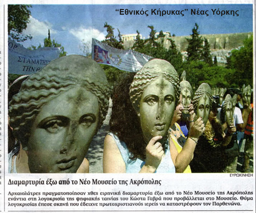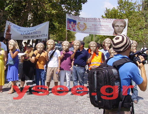 Την Κυριακή 2 Αυγούστου 2009, σε μια Αθήνα εντελώς άδεια από κατοίκους, διακόσιοι περίπου πολίτες, μεταξύ των οποίων και γνωστοί μουσικοί, σκηνοθέτες, συγγραφείς και εκδότες, συγκεντρώθηκαν μπροστά από το νέο Μουσείο της Ακρόπολης μετά από κάλεσμα της «Νεολαίας Υ.Σ.Ε.Ε. – Ακάματον Πυρ» και της «Κοινωνίας των Πολιτών», για να καταγγείλουν το πρόσφατο κρούσμα ωμής παρέμβασης των θεοκρατών της Ορθόδοξης Εκκλησίας στην πολιτιστική ζωή, με την απροκάλυπτη λογοκρισία τμήματος ενός ενημερωτικού βίντεο του σκηνοθέτη Κώστα Γαβρά που παρουσίαζε καταστροφές αγαλμάτων από χριστιανούς. Στην διαμαρτυρία παρευρέθησαν μέλη από όλες οι εταιρείες του Υπάτου Συμβουλίου των Ελλήνων Εθνικών (Υ.Σ.Ε.Ε.), δηλαδή του Υ.Σ.Ε.Ε. Βορείου Ελλάδος, του Υ.Σ.Ε.Ε. Ηνωμένων Πολιτειών, του Θιάσου «Δελφύς» και του Φιλοσοφικού Αθήναιου «Εκατηβόλος», καθώς και μέλη του πολιτικού κόμματος «Ελληνικό Ανανεωτικό Ρεύμα» (Ε.Α.Ρ.), ενώ χαιρετισμό διάβασε ο παρευρεθείς θεολόγος Γ. Μουστάκης της «Πρωτοβουλίας Δημοκρατικών Θεολόγων» («χαιρετίζω την αντιαυταρχική συγκέντρωση, τονίζοντας ότι ο χωρισμός της Εκκλησίας από το κοσμικό κράτος θα επιλύσει πολλά προβλήματα, τα οποία σήμερα εμποδίζουν τη δημοκρατική ολοκλήρωση»).