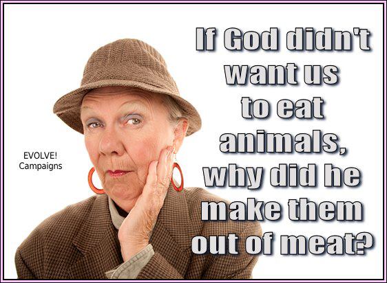 Γιατί ένας συμπονετικός Θεός να δημιούργησε πλάσματα ικανά να αντιλαμβάνονται και να συναισθάνονται τον πόνο, τον βασανισμό, και την επιθυμία να ζήσουνε, αν μόνος σκοπός τους στη ζωή ήταν να υποφέρουν και να πεθαίνουν στα χέρια των ανθρώπων;Καμιά θρησκεία δεν υπαγορεύει στους πιστούς της να τρώνε κρέας,