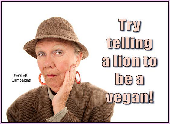 Τα λιοντάρια είναι υποχρεωτικά σαρκοφάγα, οι άνθρωποι δεν είναι! Τα λιοντάρια δεν΄εχουνε επιλογή, ο άνθρωπος όμως έχει!Η διαφορα ανάμεσα στα λιοντάρια και στον άνθρωπο είναι ότι ο άνθρωπος έχει ΕΠΙΛΟΓΗ!Τα σαρκοφάγα ζώα δεν έχουν επιλογές,