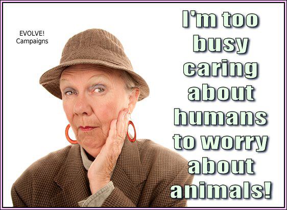 Βοηθώντας τα ζώα και βοηθώντας τους ανθρώπους δεν είναι αλληλοαποκλειόμενες δραστηριότητες. Μπορούνε να συμβαίνουνε και οι 2 ταυτόχρονα. Οι άνθρωποι που πιστεύουν στα δικαιώματα των ζώων φυσικά πιστεύουνε και στα ανθρώπινα δικαιώματα πάρα πολύ.