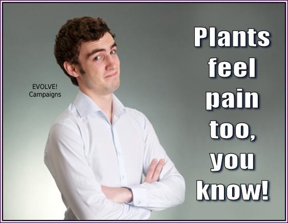 Ναι, τα φυτά είναι ζωντανά και νιώθουν “πόνο” αλλά δεν ΑΙΣΘΑΝΟΝΤΑΙ, ούτε διαθέτουν κεντρικό νευρικό σύστημα και εγκέφαλο να δεχθεί αυτά τα σήματα, επομένως, τραβώντας ένα καρότο από το έδαφος ή κόβοντας ένα μήλο από ένα δέντρο δεν έχει τις ίδιες ηθικές επιπτώσεις ,όπως το να βασανίσεις και τελικά να κόψεις το λαιμό ενός ζώου που αισθάνεται φόβο και επιθυμία για ζωή. Ωστόσο, ακόμα και αν κάποιος ανησυχεί ότι τα φυτά γίνονται αντικείμενο εκμετάλευσης κατά τον ίδιο τρόπο όπως τα ζώα , με την κατανάλωση κρέατος θα πρέπει να ανησυχεί δύο φορές περισσότερο, επειδή τα ζώα που τρώει θα έχουν φάει ήδη τα φυτά πριν από τη σφαγή (για παράδειγμα, χρειάζονται αρκετά κιλά φυτικής τροφής για την παραγωγή ΕΝΟΣ ΚΙΛΟΥ βοειού κρέατος).