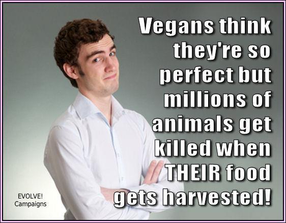 Πολύ λιγότερα ζώα θα θανατώνονταν κατά τη διάρκεια της καλλιέργειας των φυτών αν οι άνθρωποι έτρωγαν αυτές τις καλλιέργειες άμεσα, αντί της σίτισης αυτών των καλλιεργειών, για την κτηνοτροφία.Τελικά, ανεξάρτητα από το πόσο σκληρά προσπαθούμε να το αποφύγουμε, πάντα κάποια ζώα θα σκοτωθούν κατά λάθος κατά τη διάρκεια ανθρώπινα ενεργειών, αλλά η πρόθεση είναι το κλειδί εδώ. Δεν μπορούμε να ζήσουμε χωρίς τη χρήση φυτών, αλλά μπορούμε από την άλλη πλευρά να ζήσουμε πολύ καλά χωρίς να προκαλούμε σκόπιμο βασανισμό και θάνατο σε δισεκατομμύρια των εκτρεφόμενων ζώων.Ακόμη και να σκοτωθούνε απο ατύχημα μερικά ζώα μετά δεν θα φάμε τα νεκρά κουφάρια τους!