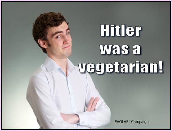 «Εσείς οι χορτοφάγοι που λέτε ότι όλοι θα ήταν πιο ήρεμοι, αν τρώγαμε μια χορτοφαγική διατροφή φαίνεται να ξεχνάτε ότι Αδόλφος Χίτλερ ήταν χορτοφάγος. Αυτό καταστρέφει αρκετά καλά το σύστημα πεποιθήσεων σας, δεν είναι.;”Πω πω, σοβαρά; Ένα άτομο μπορεί να καταστρέψει ένα ολόκληρο σύστημα πεποιθήσεων;!
