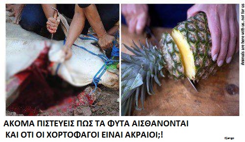 Το veganism είναι ένας τρόπος ζωής που αποβλέπει στον αποκλεισμό κάθε μορφής εκμετάλλευσης και σκληρότητας στο ζωικό βασίλειο, αλλά η διαφορά είναι ότι δεν μπορούμε να ζήσουμε χωρίς τη χρήση φυτών. Μπορούμε από την άλλη πλευρά να ζήσουμε πολύ καλά χωρίς να προκαλούμε πόνο σκόπιμο (και θάνατο) σε δισεκατομμύρια των εκτρεφόμενων ζώων.ΤΑ ΦΥΤΑ ΝΙΩΘΟΥΝ, ΕΧΟΥΝ ΕΥΦΥΪΑ, ΑΛΛΑ ΔΕΝ ΑΙΣΘΑΝΟΝΤΑΙ ΟΠΩΣ ΟΙ ΑΝΘΡΩΠΟΙ ΚΑΙ ΤΑ ΖΩΑ, ΔΕΝ ΑΙΣΘΑΝΟΝΤΑΙ ΦΟΒΟ ΑΓΑΠΗ ΧΑΡΑ Ή ΛΥΠΗ.