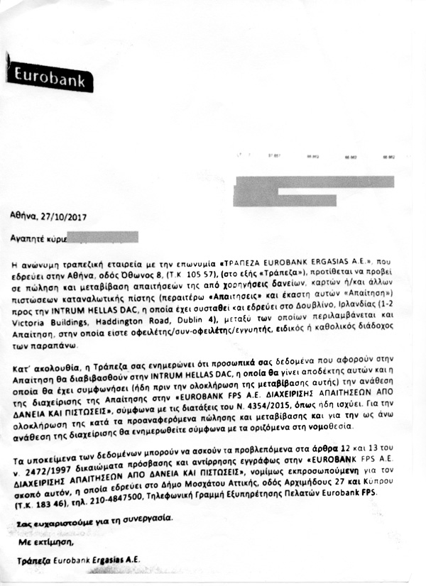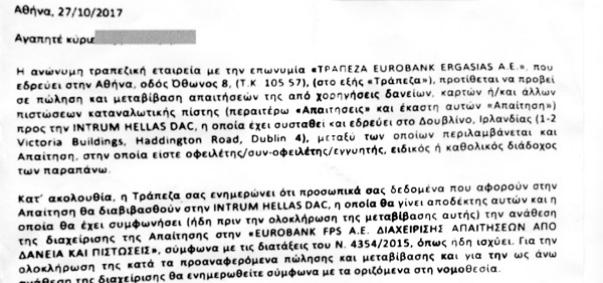 Μια από αυτές, η Eurobank -σε επιστολή της προς δανειολήπτη με ημερομηνία 27 Οκτωβρίου, ενημερώνει ότι «προτίθεται να προβεί σε πώληση και μεταβίβαση απαιτήσεών της από χορηγήσεις δανείων, καρτών ή και άλλων πιστώσεων καταναλωτικής πίστης προς την INTRUM HELLAS DAC[σ.σ.: θυγατρική ιρλανδικού fund με έδρα το Δουβλίνο (το έγγραφο αναφέρει έως και τη διεύθυνσή του)]». Όπως αναφέρεται στη σχετική ενημερωτική επιστολή, από το σημείο μεταβίβασης και μετά ο οφειλέτης θα συνεργάζεται πλέον με τον συγκεκριμένο αλλοδαπό φορέα και όχι με την τράπεζα.
