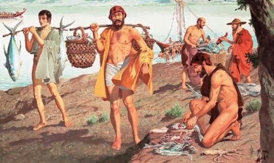 Οι ιδιοκτήτες των αγροκτημάτων που ήταν γύρω από την πόλη, έστελναν τα προϊόντα τους για ανταλλαγή. Από τον Πειραιά και το Φάληρο έφταναν ψαράδες. στα καλάθια τους έφερναν τόνο, από τον Εύξεινο Πόντο χέλια, που τα αγαπούσαν πάρα πολύ οι Αθηναίοι, και μπαρμπούνια από το Αρχιπέλαγος. Από τα μικρομάγαζα και τα μαγειρεία των πραματευτάδων σκορπάει στον καθαρό πρωινό αέρα το άρωμα των ώριμων φρούτων, η οσμή του θυμιάματος, η μυρωδιά από τα δέρματα, το τουρσί, την ώριμη μελιτζάνα, το πηγμένο αίμα, το κρασί, την πρασινάδα, κι απ’ τις αρμάθες των ζεστών κουλουριών, που τραβούν τη ματιά των πεινασμένων αγοραστών. Ο θόρυβος σε ξεκουφαίνει. το πλήθος κινείται προς όλες τις κατευθύνσεις.