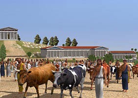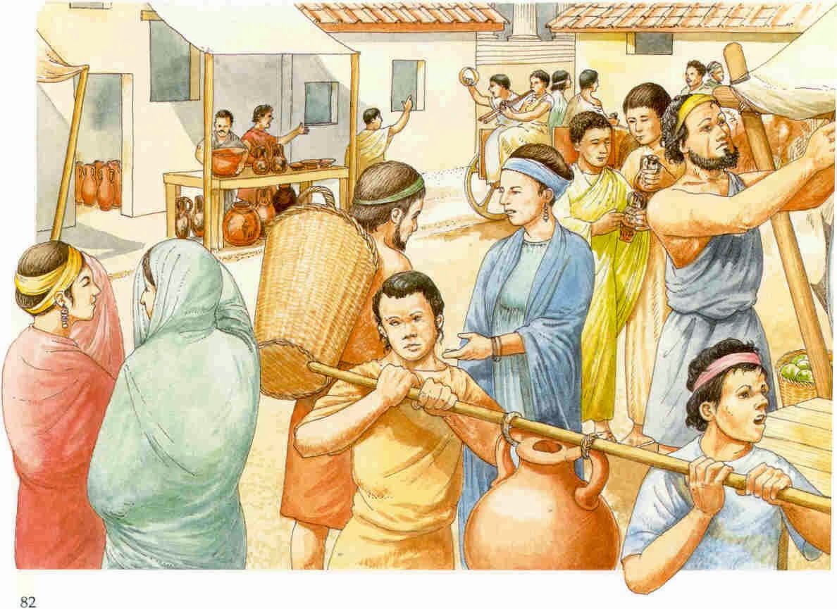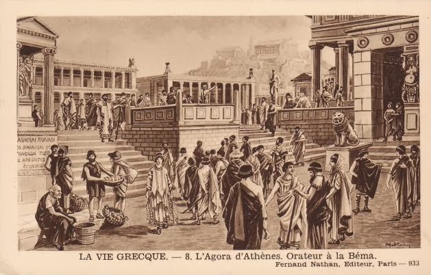 Όπως είπαμε, στη ζωηρή αγορά της Αθήνας μπορούσαν να συναντηθούν κάθε λογής άνθρωποι, πλούσιοι και φτωχοί. Να ένας ανάπηρος, πελάτης του ρήτορα Λυσία που ζει με τη σύνταξη που του πληρώνει το κράτος. Γύρω του έχουν μαζευτεί μερικοί πλούσιοι νέοι. Τα καυστικά, τα δηκτικά του αστεία τούς διασκεδάζουν. Ένας χωριάτης κουβαλάει στην πλάτη ένα σακί, μέσα από το οποίο ακούονται να γρυλίζουν μερικά γουρουνάκια. τώρα παραμέρισε από το δρόμο για να περάσει ένας στρατηγός. Δαμαστές φιδιών συναγωνίζονται με τους ιδιοκτήτες άλλων εξημερωμένων ή άγριων ζώων. μια ομάδα εύθυμων θεατών πηγαίνουν από τους θαυματοποιούς και τους ταχυδακτυλουργούς σ’ αυτόν που καταπίνει σπαθιά και αναμμένα ξύλα.