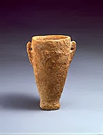 Τα συγκεκριμένο αγγείο έχει λεπτή βάση, κωνικό σώμα και δύο πτερυγιόσχημες διάτρητες αποφύσεις ως λαβές. Στη μία όψη, στο ύψος των λαβών, διακρίνονται τρία μικρά εξογκώματα. Ορισμένοι μελετητές θεωρούν ότι τα εξογκώματα αυτά συμβολίζουν τα μάτια και το στόμα μιας έμβιας μορφής ενώ οι λαβές αντιστοιχούν στα αυτιά, και ερμηνεύουν το αγγείο ως συμβολική απεικόνιση μιας ανθρώπινης μορφής ή, ενδεχομένως, ενός βουκρανίου.