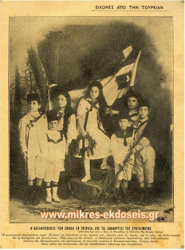 Μια σχετική φωτογραφία δημοσιεύεται πρωτοσέλιδα στην «Ελλάδα» στις 16 Νοεμβρίου 1908, όπου δείχνει αδελφωμένα τα παιδιά όλων των εθνών του τουρκικού κράτους. Η φωτογραφία αυτή (φωτο 5) η οποία «εστάλη υπό του κ. Φωκ. Φωτιάδου, εξ Αϊδινίου της Μικράς Ασίας», στο κάτω μέρος αναφέρει: