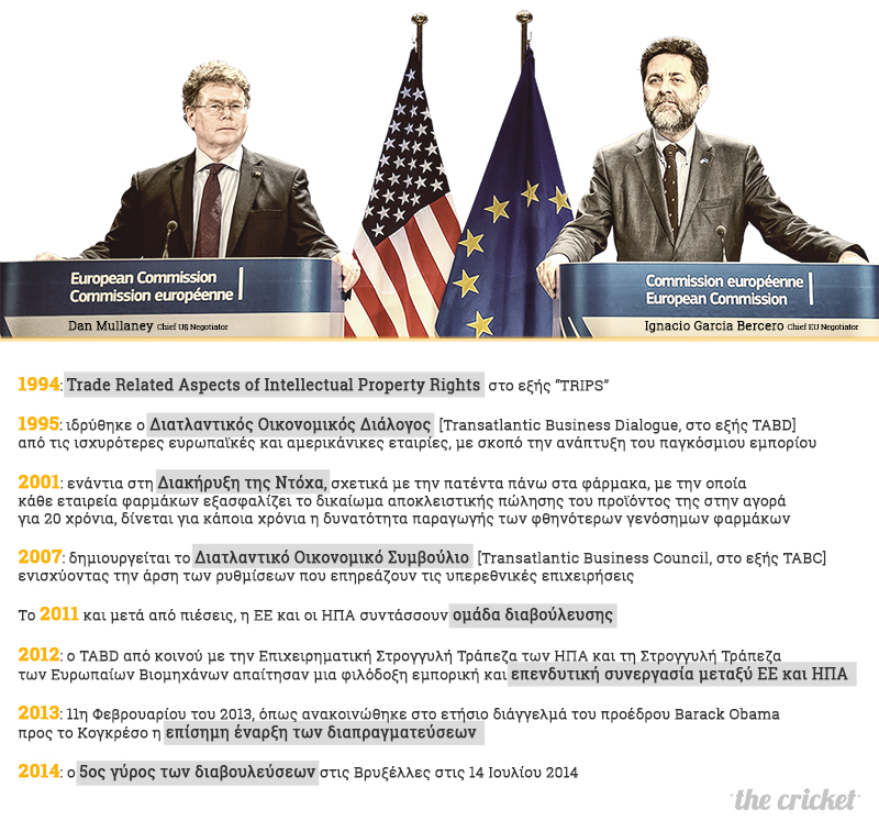 Σε παράλληλους χρόνους με την TRIPS και υπό πλήρη μυστικοπάθεια, το 1995 ιδρύθηκε ο Διατλαντικός Οικονομικός Διάλογος (Transatlantic Business Dialogue, στο εξής TABD) από τις ισχυρότερες ευρωπαϊκές και αμερικάνικες εταιρίες, με σκοπό την ανάπτυξη του παγκόσμιου εμπορίου (9). Σχεδόν μια δεκαετία αργότερα, το 2007, δημιουργείται το Διατλαντικό Οικονομικό Συμβούλιο (Transatlantic Business Council, στο εξής TABC) ενισχύοντας την άρση των ρυθμίσεων που επηρεάζουν τις υπερεθνικές επιχειρήσεις (10). Το 2011 και μετά από πιέσεις, η ΕΕ και οι ΗΠΑ συντάσσουν ομάδα διαβούλευσης των παραπάνω εργασιών και μετά από αρκετές συναντήσεις, τον Απρίλιο του 2012, ο TABD από κοινού με την Επιχειρηματική Στρογγυλή Τράπεζα των ΗΠΑ και τη Στρογγυλή Τράπεζα των Ευρωπαίων Βιομηχάνων απαίτησαν μια φιλόδοξη εμπορική και επενδυτική συνεργασία μεταξύ ΕΕ και ΗΠΑ (11).