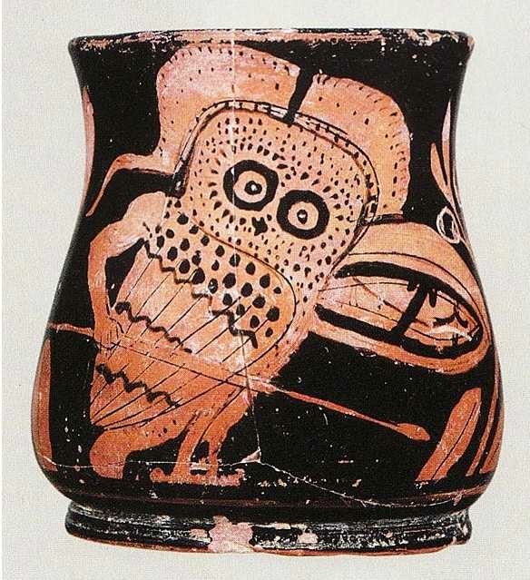 | Η «μεγάλη χαλκή Αθηνά» -Ασυνήθιστη παράσταση της Αθηνάς στον τύπο της Προμάχου με την μορφή γλαυκός, συμβόλου της σοφίας για τους Έλληνες, σε ερυθρόμορφο σκύφο (5ος -4ος αι. π.Χ.). |