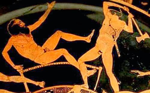Κρυβόταν στους θάμνους στην άκρη του δρόμου και, μόλις έβλεπε κάποιο μοναχικό διαβάτη, πεταγόταν από την κρυψώνα του, του έπαιρνε με τη βία καθετί πολύτιμο και μετά, χτυπώντας τον με το σιδερένιο ρόπαλο, τον σκότωνε. Ο Θησέας ήρθε αντιμέτωπος με το ληστή και τον σκότωσε παίρνοντας μαζί του και το πελώριο σιδερένιο ρόπαλό του.”