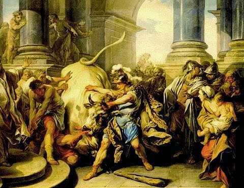 8. Ο Μινώταυρος : Αργότερα ο Θησέας θέλησε να τερματίσει το βάναυσο φόρο αίματος που πλήρωνε η πόλη κάθε εννιά χρόνια με εφτά νέους και εφτά νέες στην Μινωική Κρήτη. Η βάναυση αυτή ποινή είχε οριστεί από τον Μίνωα διότι ο γιος του Μίνωα Ανδρόγεως, είχε πάρει μέρος σε αγώνες στα Παναθήναια επιτυγχάνοντας πολλές νίκες, προκαλώντας έτσι τον φθόνο των Αθηναίων, οι οποίοι τον σκότωσαν.