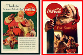 Η μορφή του σύγχρονου Αγιοβασίλη (ευτραφής χαμογελαστός γέρος με άσπρη γενειάδα και ερυθρόλευκη ένδυση) οφείλεται σε διαφημίσεις της Coca Cola. Αριστερά μια από τις πρώτες (του 1938) και δεξιά μιά διαφήμιση της δεκαετίας του ΄50. |