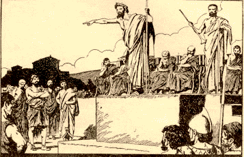 Και μη βρίσκοντας διέξοδο από πουθενά καθώς τα συλλογίζονταν όλ’ αυτά, εχτρεύονταν τον Περικλή περισσότερο. Αυτός, βλέποντάς τους ν’ αγανακτούνε και να βαρυγκομούν για όλα όσα είχε ο ίδιος υπόψη του πως θα συνέβαιναν, κάλεσε σύναξη του λαού (γιατί ήταν ακόμα στρατηγός) θέλοντας να τους εγκαρδιώσει και να μαλακώσει την οργισμένη τους διάθεση, και συνάμα να τους βγάλει από την ψυχή τους το μεγάλο τους φόβο· και πρόβαλε στο βήμα και είπε απάνω–κάτω τα ακόλουθα.